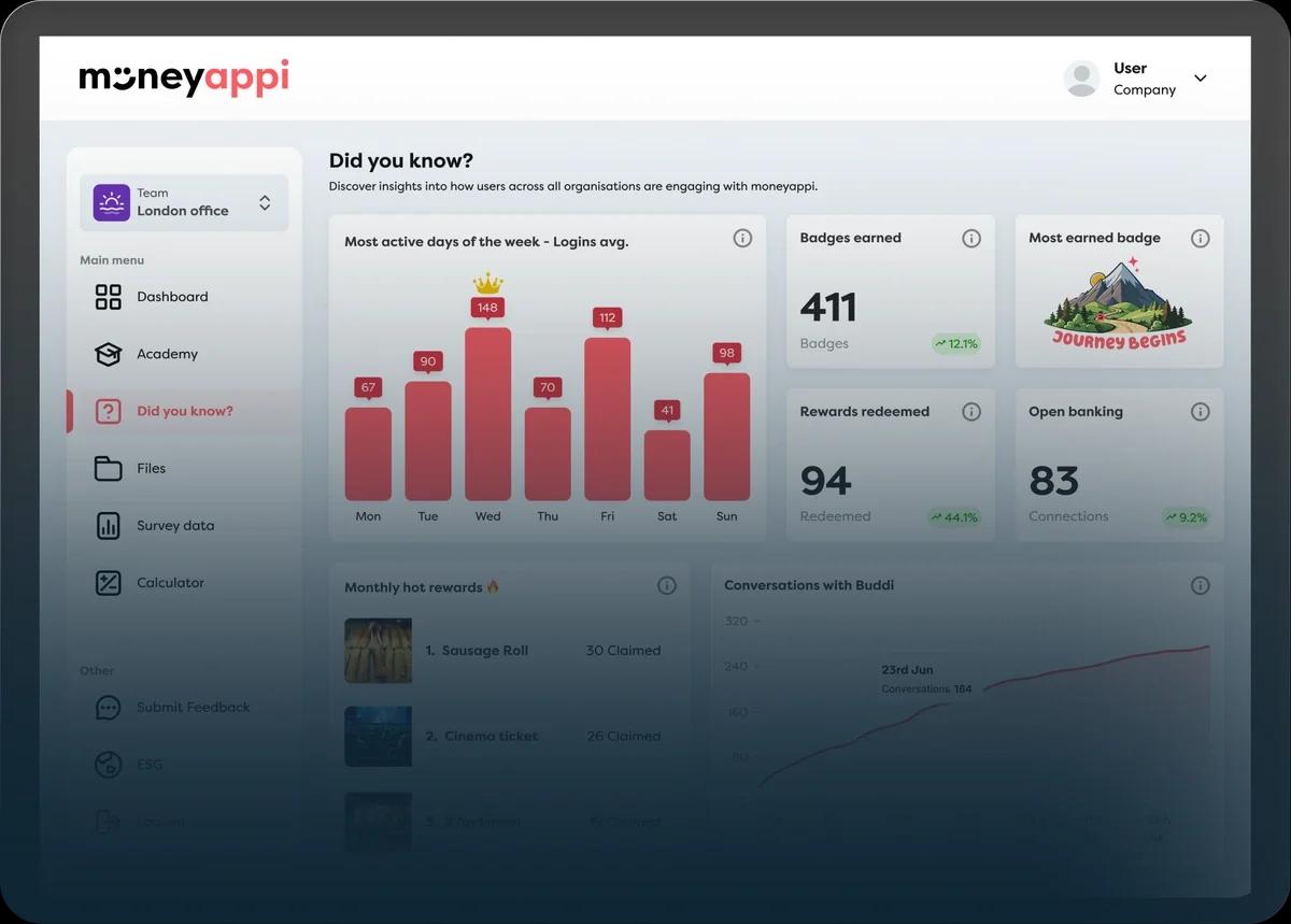 Financial stress impacts 76% of employees yet most benefits fail to engage because they aren’t personal. moneyappi changes that. Through AI-powered personalisation, gamified habit-building, and real-time guidance from Buddi™, we turn financial wellbeing from a passive benefit into a daily, high-engagement experience employees actually use and value.
