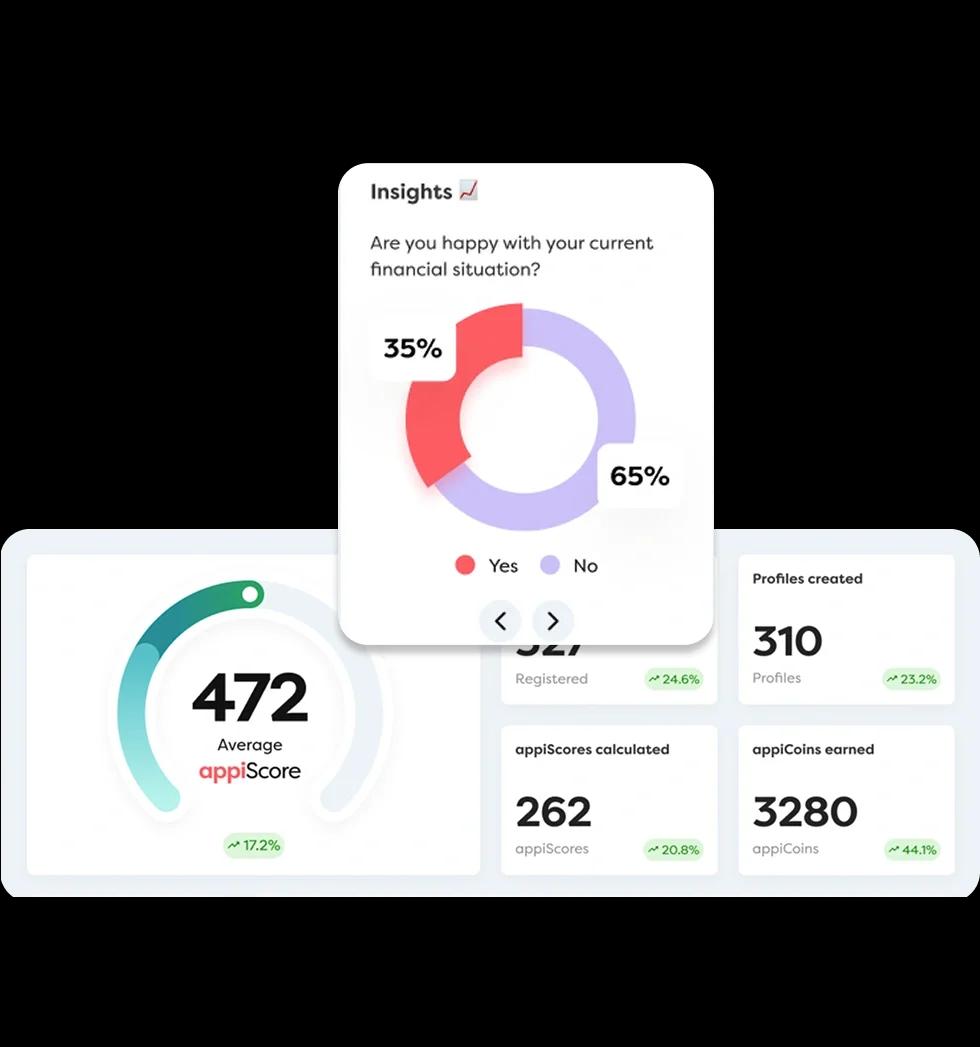 Modelled from our pioneering methodology in collaboration with academic and industry experts, enhanced with AI technology, appiScore engine provides an insightful quantification to measure financial wellbeing.